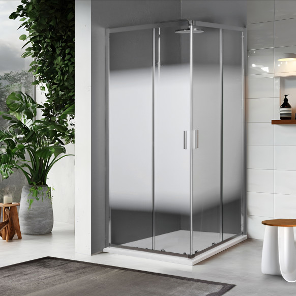 Angolare rettangolare. Si adatta a tutti i tipi di piatti doccia: ceramica con bordo alto, acrilici, moderni senza bordo, piastrelle e filo pavimento. Le ante fisse e quelle scorrevoli sono corredate da un kit di guarnizioni di tenuta verticali, pensate per isolare al meglio la cabina doccia ed impedire le fuoriuscite d'acqua. Grazie al suo sistema ad incastro, bastano pochi semplici passaggi e il box è pronto.